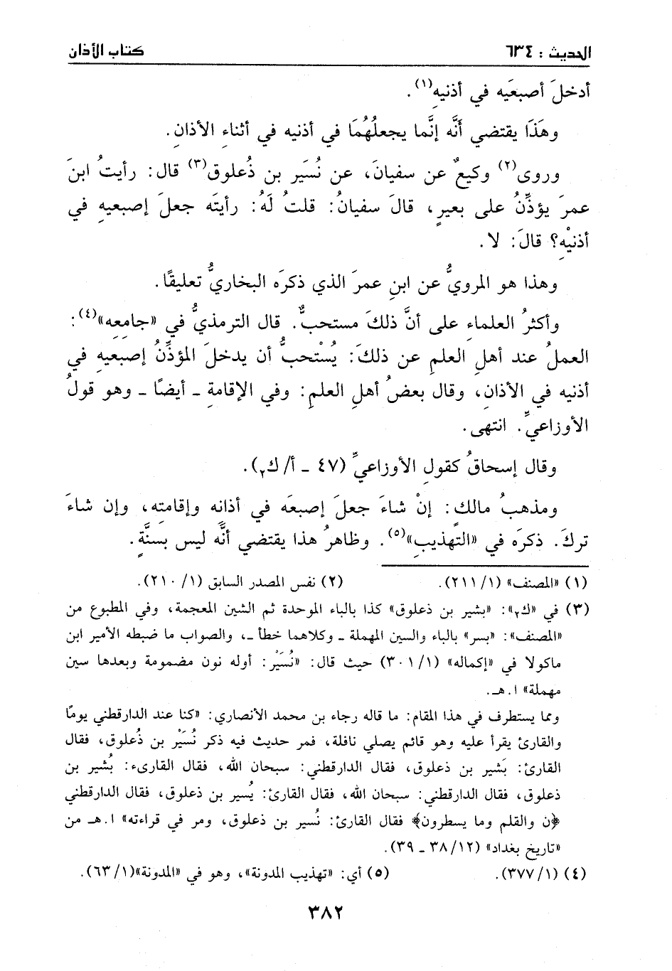قال الترمذي في ((جامعه)) : العمل عند اهل العلم على ذلك، يستحب ان يدخل المؤذن إصبعيه في أذنيه في الاذان. وقال بعض اهل العلم: وفي الاقامة – أيضا، وهو قول الاوزاعي. انتهى.