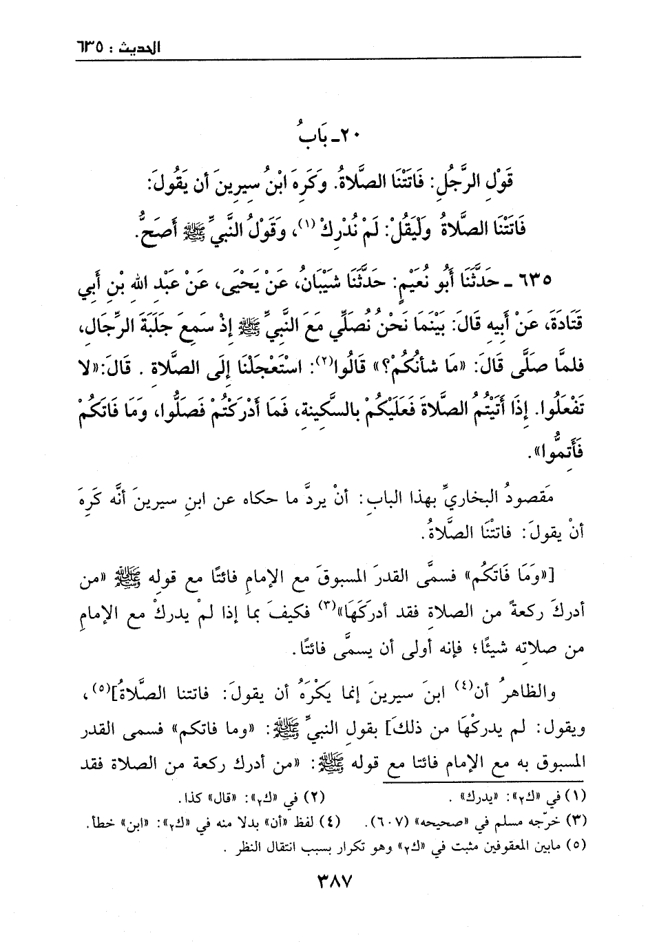 635 - حدثنا ابو نعيم: حدثنا شيبان، عن يحيى، عن عبد الله بن أبي قتادة، عن أبيه، قال: بينما نحن نصلي مع النبي - صَلَّى اللهُ عَلَيْهِ وَسَلَّمَ -، إذ سمع جلبة الرجال، فلما صلى قال: ((ما شأنكم؟)) قالوا: استعجلنا إلى الصلاة. قال: ((فلا تفعلوا، إذا أتيتم الصلاة فعليكم بالسكينة، فما أدركتم فصلوا، وما فاتكم فأتموا)) .