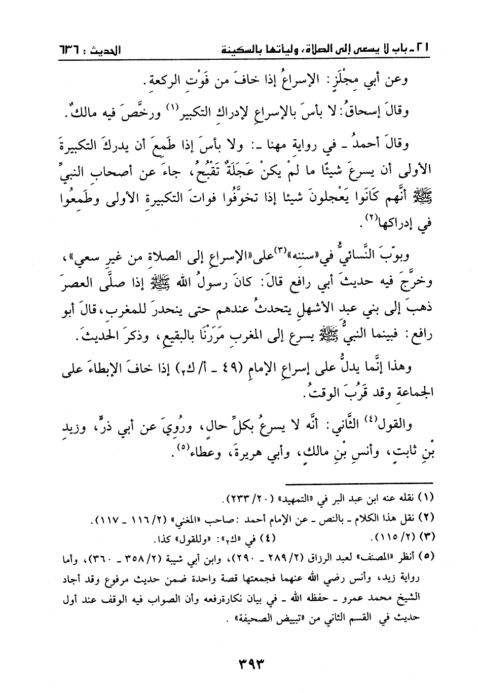 وبوب النسائي في ((سننه)) على ((الإسراع إلى الصلاة من غير سعي)) ، وخرج فيه حديث أبي رافع، قال: كان الرسول الله - صَلَّى اللهُ عَلَيْهِ وَسَلَّمَ - إذاصلى العصر ذهب إلى بني عبد الأشهل، يتحدث عندهم حتى ينحدر المغرب. قال أبو رافع: فبينما النبي - صَلَّى اللهُ عَلَيْهِ وَسَلَّمَ - يسرع إلى المغرب مررنا بالبقيع - وذكر الحديث.