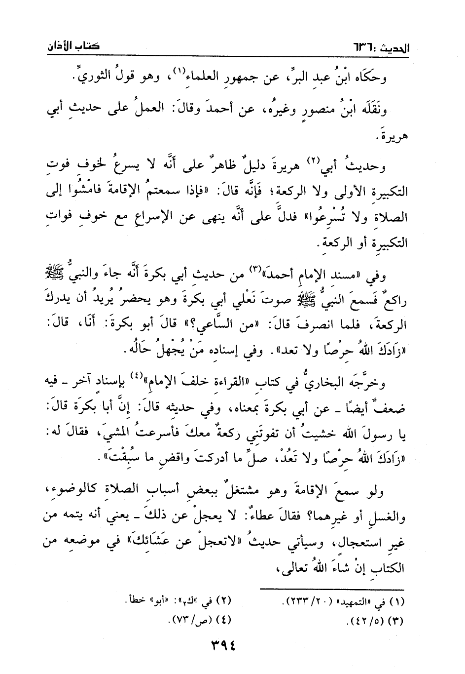 وحديث أبي هريرة: دليل ظاهر على أنه لإيسرع لخوف فوت التكبيرة الأولى، ولا الركعة؛ فانه قال: ((فإذا سمعتم الإقامة فامشوا إلى الصلاة، ولا تسرعوا)) ، فدل على أنه ينهى عن الإسراع مع خوف فوات التكبيرة أو الركعة.