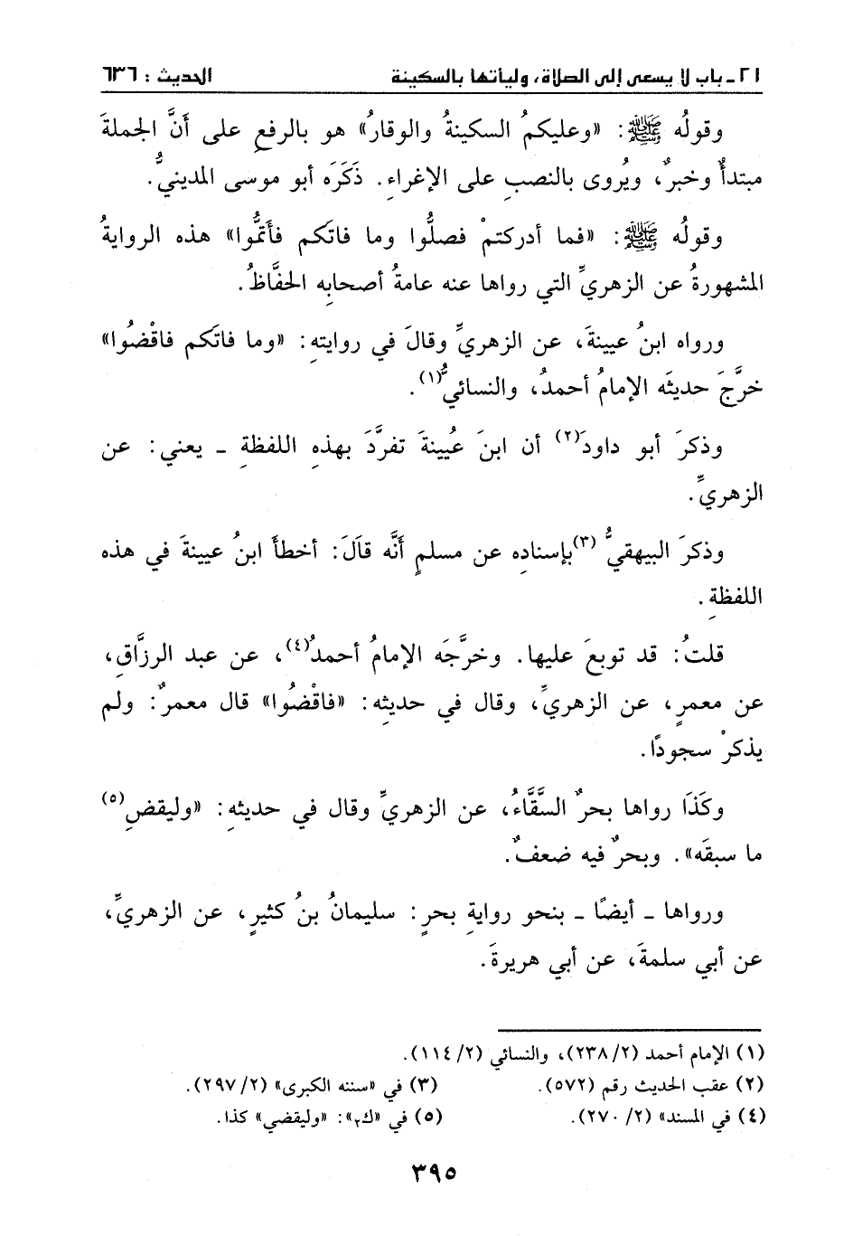 وقوله - صَلَّى اللهُ عَلَيْهِ وَسَلَّمَ -: ((فما أدركتم فصلوا، وما فاتكم فأتموا)) ، هذه الرواية المشهورة عن الزهري، التي راوها عنه عامة أصحابه الحفاظ.