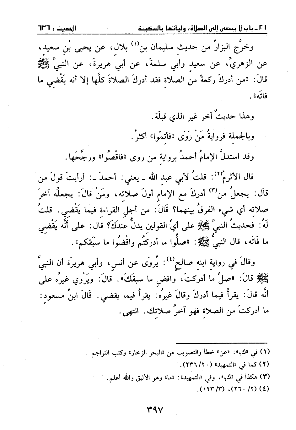 قال الأثرم: قلت لأبي عبد الله – يعني: أحمد - أرأيت قول من قال: يجعل من أدرك مع الإمام أول صلاته، وقد قال: يجعله آخر صلاته، أي شيء الفرق بينهما؟ قال: من أجل القراءة فيما يقضي. قلت له: فحديث النبي - صَلَّى اللهُ عَلَيْهِ وَسَلَّمَ -: على أي القولين يدل عندك؟ قال: على أنه يقضي ما فاته؛ قال النبي - صَلَّى اللهُ عَلَيْهِ وَسَلَّمَ -: ((صلوا ما ادركتم واقضوا ما سبقكم)) .