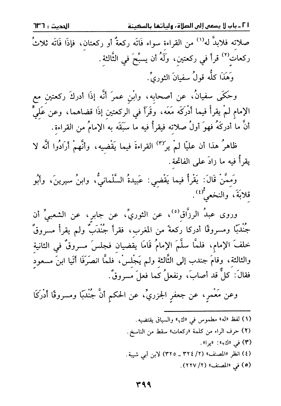 وروى عبد الرزاق، عن الثوري، عن جابر، عن الشعبي، ان جندباً ومسروقاً أدركا ركعة من المغرب، فقرأ جندب ولم يقرأ مسروق خلف الإمام، فلما سلم الإمام قأمايقضيان، فجلس مسروق في الثانية والثالثة، وقام جندب إلى الثالثة ولم يجلس، فلما انصرفا أتيا ابن مسعود، فقال: كل قد أصاب، ونفعل كما فعل مسروق.