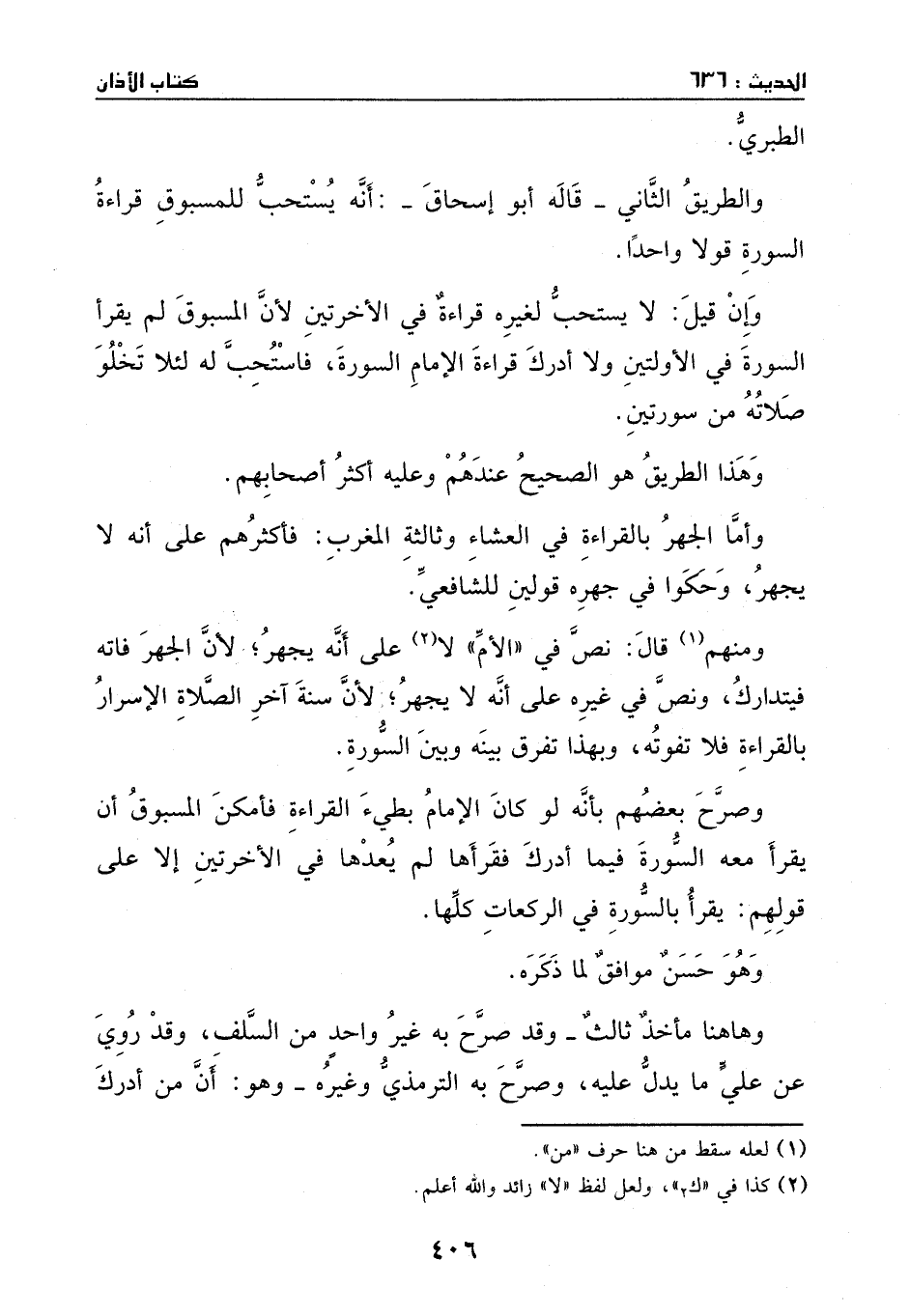وصرح بعضهم بأنه لو كان الإمام بطيء القراءة فأمكن المسبوق أن يقرأ معه السورة فيما أدرك فقرأها، لم يعدها في الأخريين، إلا على قولهم: يقرأ بالسورة في الركعات كلها، وهو حسن موافق لما ذكره.