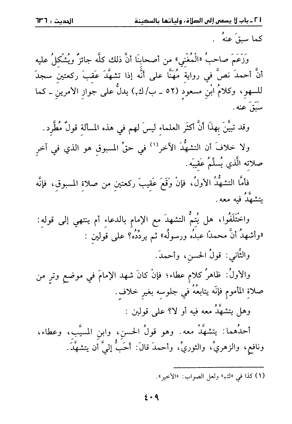 ولا خلاف أن التشهد الأخر في حق المسبوق هو الذي في آخر صلاته، الذي يسلم عقيبه، فأماالتشهد الأول، فإن وقع عقيب ركعتين من صلاة المسبوق، فإنه يتشهد فيه معه.