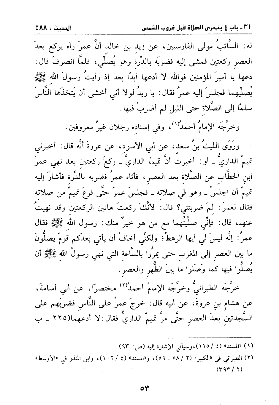 وخرجه الإمام أحمد – مختصراً -، عن أبي أسامة، عن هشام بن عروة، عن أبيه، قال: خرج عمر على الناس يضربهم على السجدتين بعد العصر، حتى مر بتميم الداري، فقال: لا أدعهما؛