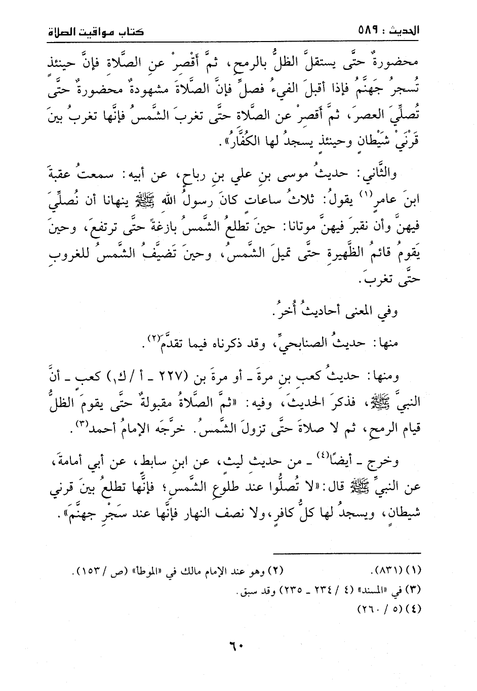 والثاني: حديث موسى بن علي بن رباح، عن أبيه: سمعت عقبة بن عامر يقول: ثلاث ساعات كان رسول الله - صَلَّى اللهُ عَلَيْهِ وَسَلَّمَ - ينهانا أن نصلي فيهن، وأن نقبر فيهن موتانا: حين تطلع الشمس بازعة حتى ترتفع، وحين يقوم قائم الظهيرة حتى تميل الشمس، وحين تضيف الشمس للغروب حتى تغرب.