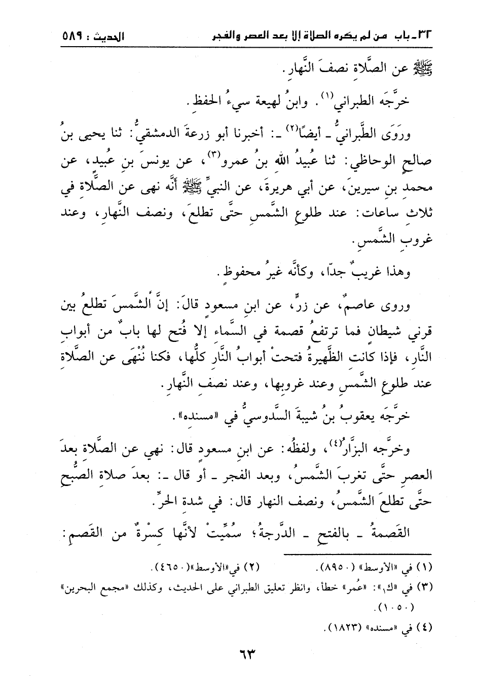 وخرجه البزار، ولفظه: عن ابن مسعود، قال: نهي عن الصلاة بعد العصر حتى تغرب الشمس، وبعد الفجر – أو قال: بعد صلاة الصبح – حتى تطلع الشمس، ونصف النهار. قال: في شدة الحر.