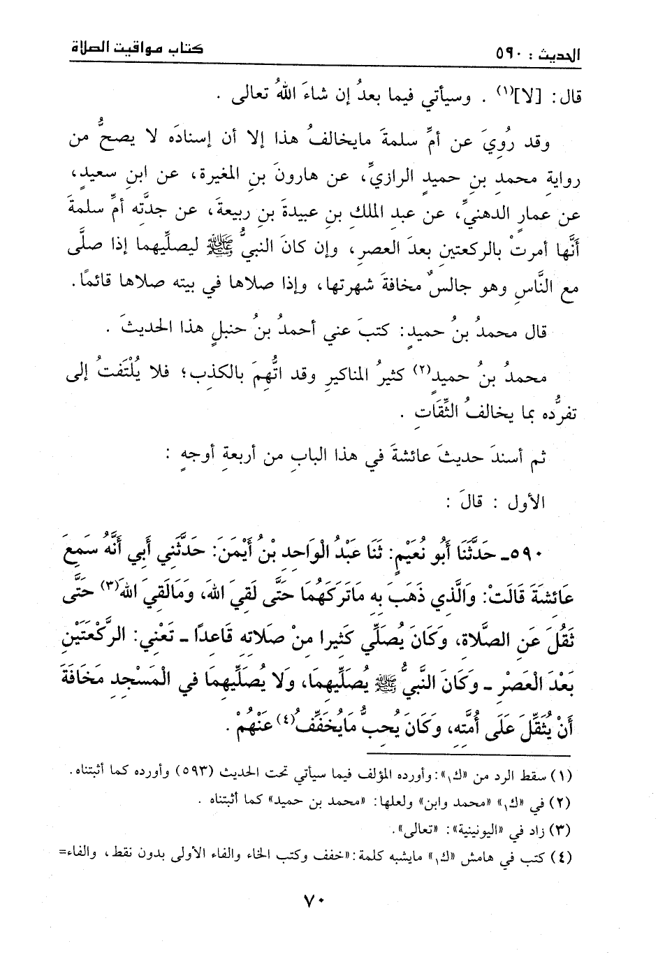 590 - حدثنا أبو نعيم: ثنا عبد الواحد بن أيمن: حدثني أبي، أنه سمع عائشة قالت: والذي ذهب به، ما تركهما حتى لقي الله، وما لقي الله حتى ثقل عن الصلاة، وكان يصلي كثيراً من صلاته قاعداً - تعني: الركعتين بعد العصر -، وكان النبي - صَلَّى اللهُ عَلَيْهِ وَسَلَّمَ - يصليهما، ولا يصليهما في المسجد، مخافة أن يثقل على أمته، وكان يحب ما يخفف عنهم.