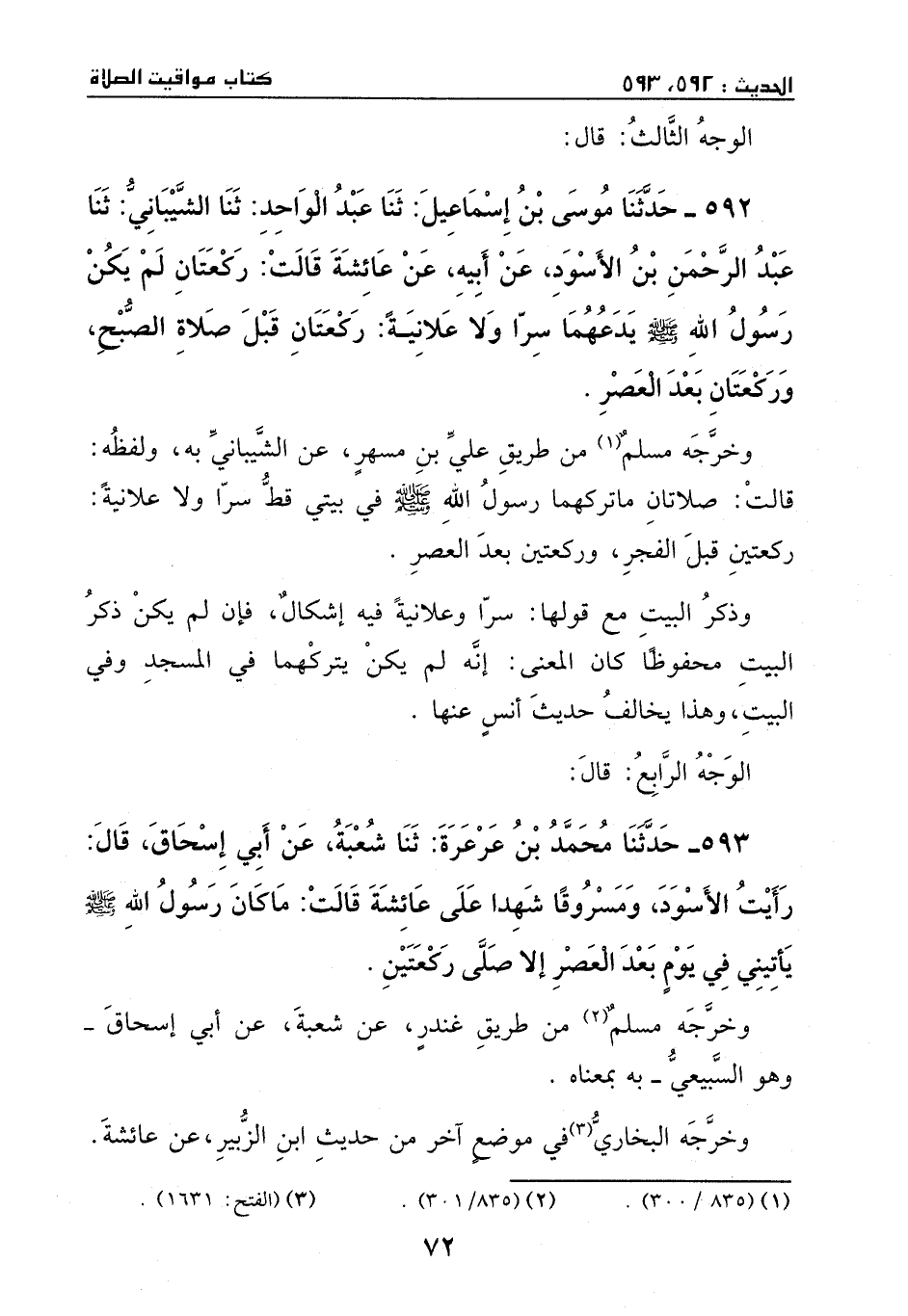 593 - حدثنا محمد بن عرعرة: ثنا شعبة، عن أبي إسحاق، قال: رأيت الأسود ومسروقاً شهداً على عائشة، قالت: ما كان رسول الله - صَلَّى اللهُ عَلَيْهِ وَسَلَّمَ - يأتيني في يوم بعد العصر إلا صلى ركعتين.