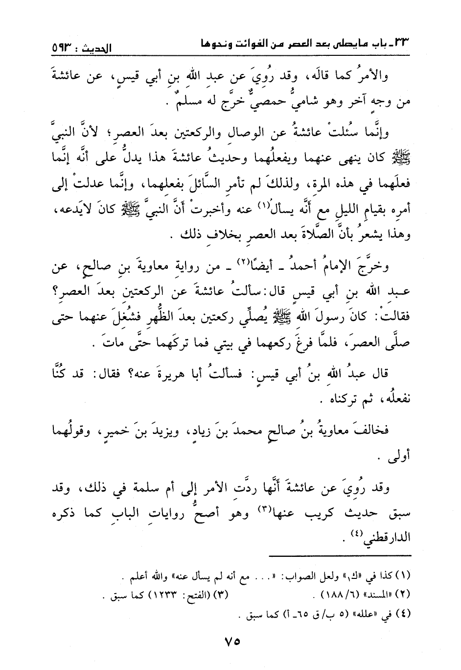 وخرج الإمام أحمد – أيضا – من رواية معاوية بن صالح، عن عبد الله بن أبي قيس، قال: سألت عائشة عن الركعتين بعد العصر؟ فقالت: كان رسول الله - صَلَّى اللهُ عَلَيْهِ وَسَلَّمَ - يصلي ركعتين بعد الظهر، فشغل عنهما حتى صلى العصر، فلما فرغ ركعهما في بيتي، فما تركهما حتى مات.
