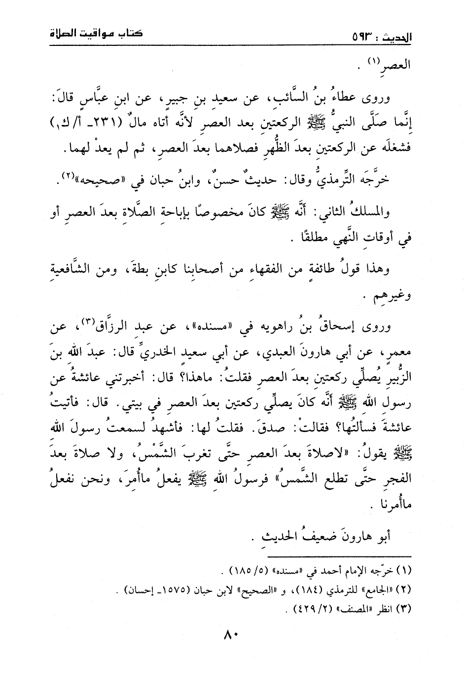 وروى إسحاق بن راهويه في (مسنده) عن عبد الرزاق، عن معمر، عن أبي هارون العبدي، عن أبي سعيد الخدري، قال: رأيت عبد الله بن الزبير يصلي ركعتين بعد العصر، فقلت: ما هذ؟ قال: أخبرتني عائشة عن رسول الله - صَلَّى اللهُ عَلَيْهِ وَسَلَّمَ -، أنه كان يصلي ركعتين بعد العصر في بيتي، قال: فأتيت عائشة، فسألتها، فقالت: صدق، فقلت لها: فأشهد لسمعت رسول الله - صَلَّى اللهُ عَلَيْهِ وَسَلَّمَ - يقول: (لا صلاة بعد العصر حتى تغرب الشمس، ولا صلاة بعد الفجر حتى تطلع الشمس) ، فرسول الله - صَلَّى اللهُ عَلَيْهِ وَسَلَّمَ - يفعل ما أمر، ونحن نفعل ما أمرنا.