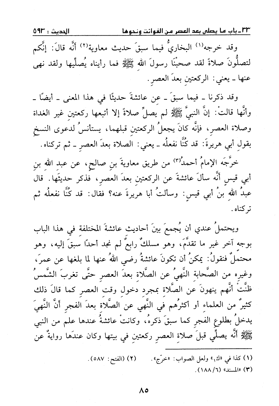 وقد خرج البخاري فيما سبق حديث معاوية، أنه قال: إنكم لتصلون صلاة، لقد صحبنا رسول الله - صَلَّى اللهُ عَلَيْهِ وَسَلَّمَ - فما رأيناه يصليها، ولقد نهى عنها – يعني: الركعتين بعد العصر.