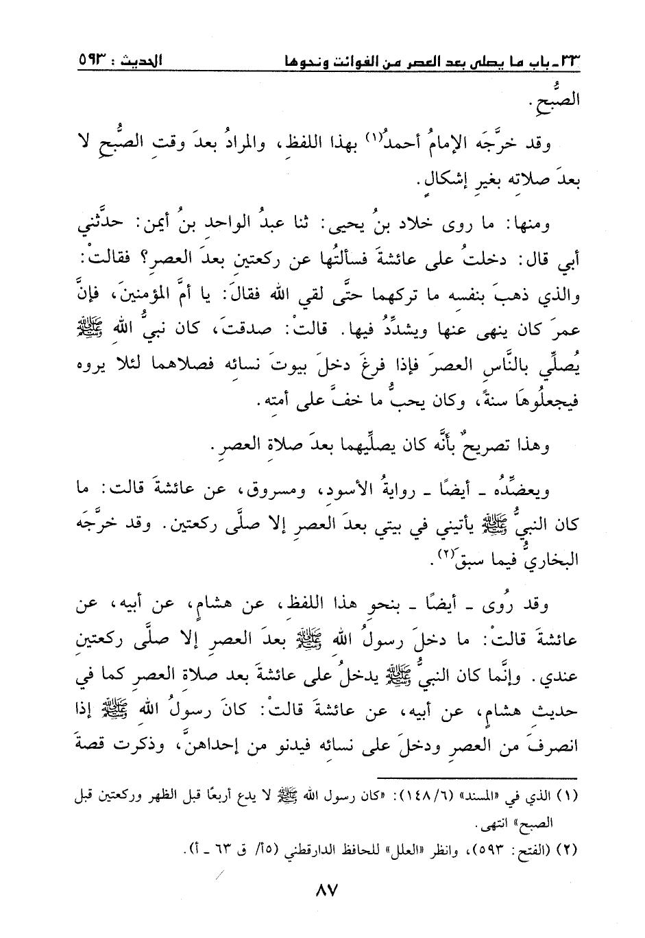ومنها: ما روى خلاد بن يحيى: ثنا عبد الواحد بن أيمن: حدثني أبي، قال: دخلت على عائشة، فسألتها عن ركعتين بعد العصر؟ فقالت: والذي ذهب بنفسه، ما تركهما حتى لقي الله. فقال: يا أم المؤمنين، فإن عمر كان ينهى عنها ويشدد فيها؟ قالت: صدقت، كان نبي الله - صَلَّى اللهُ عَلَيْهِ وَسَلَّمَ - يصلي بالناس العصر، فإذا فرغ دخل بيوت نسائه فصلاهما؛ لئلا يروه فيجعلوها سنة، وكان يحب ما خف على أمته.