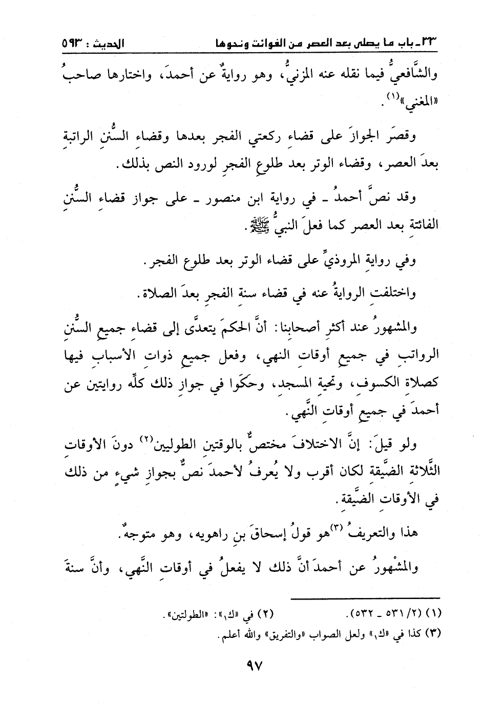 وقد نص أحمد في رواية ابن منصور على جواز قضاء السنن الفائتة بعد العصر، كما فعل النبي - صَلَّى اللهُ عَلَيْهِ وَسَلَّمَ -.