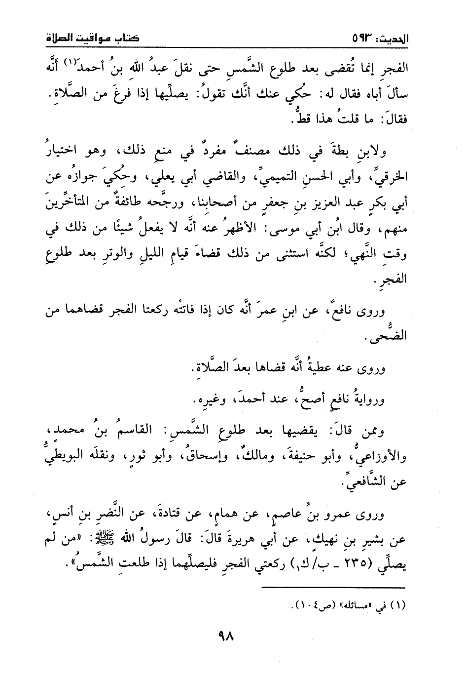 وقال ابن أبي موسى: الأظهر عنه أنه لا يفعل شيئاً من ذلك في وقت النهي، لكنه استثنى من ذلك قضاء قيام الليل والوتر بعد طلوع الفجر.