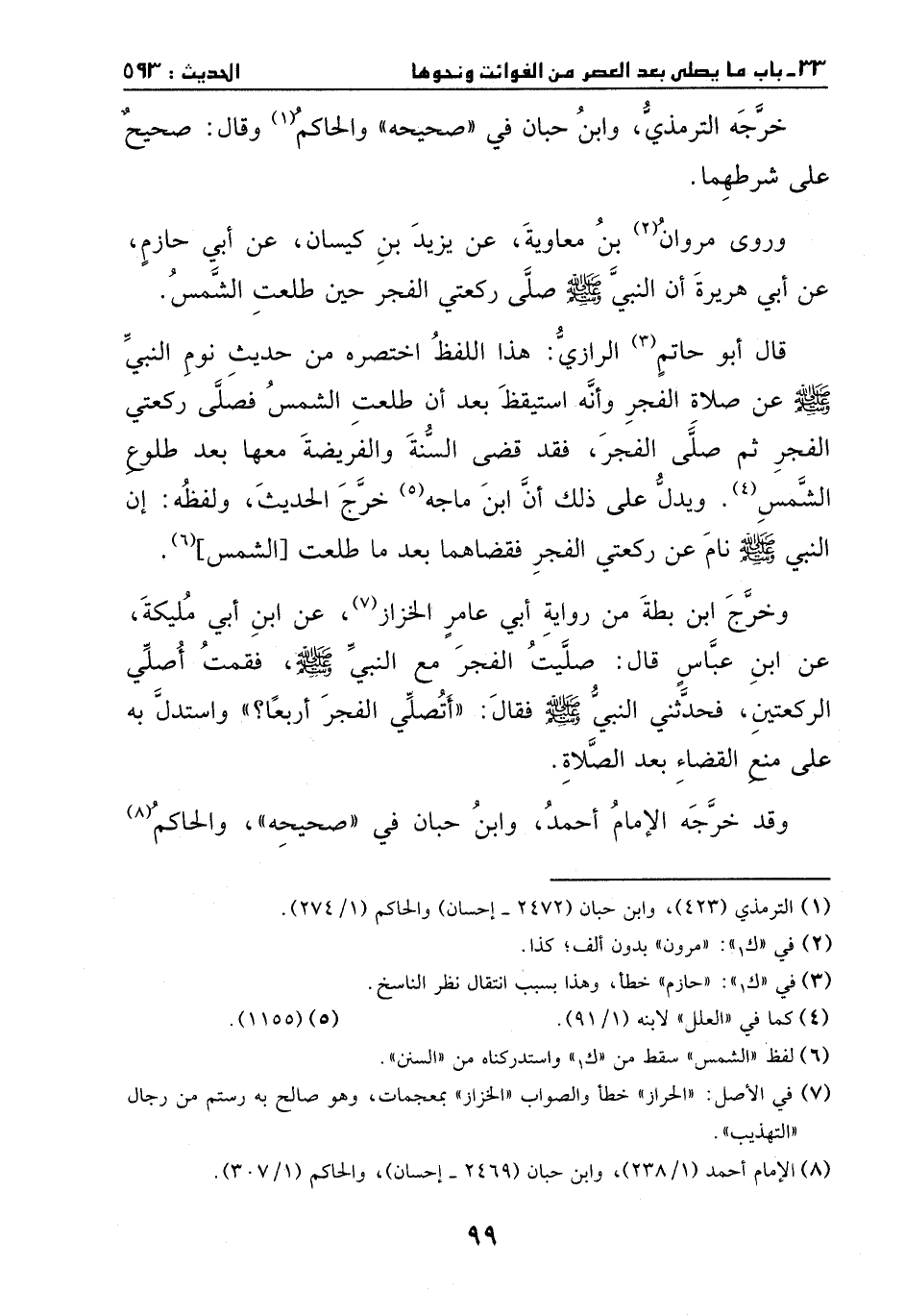 قال أبو حاتم الرازي: هذا اللفظ اختصره من حديث نوم النبي - صَلَّى اللهُ عَلَيْهِ وَسَلَّمَ - عن صلاة الفجر، وأنه استيقظ بعد أن طلعت الشمس، فصلى ركعتي الفجر، ثم صلى الفجر، فقد قضى السنة والفريضة معها بعد طلوع الشمس.