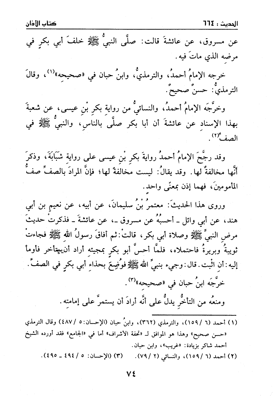 وروى هَذَا الحَدِيْث معتمر بْن سُلَيْمَان، عَن أبيه، عَن نعيم بْن أَبِي هند، عَن أَبِي وائل، أحسبه عَن مسروق، عَن عَائِشَة – فذكرت حَدِيْث مرض النَّبِيّ - صَلَّى اللهُ عَلَيْهِ وَسَلَّمَ -، وصلاة أَبِي بَكْر. قَالَتْ: ثُمَّ أفاق رَسُول الله - صَلَّى اللهُ عَلَيْهِ وَسَلَّمَ -، فجاءت نوبة وبريرة فاحتملاه، فلما أحس أبو بَكْر بمجيئه أراد أن يتأخر، فأومأَ إليه أن اثبت. قَالَ: وجيء بنبي الله - صَلَّى اللهُ عَلَيْهِ وَسَلَّمَ -، فوضع بحذاء أَبِي بَكْر فِي الصف.