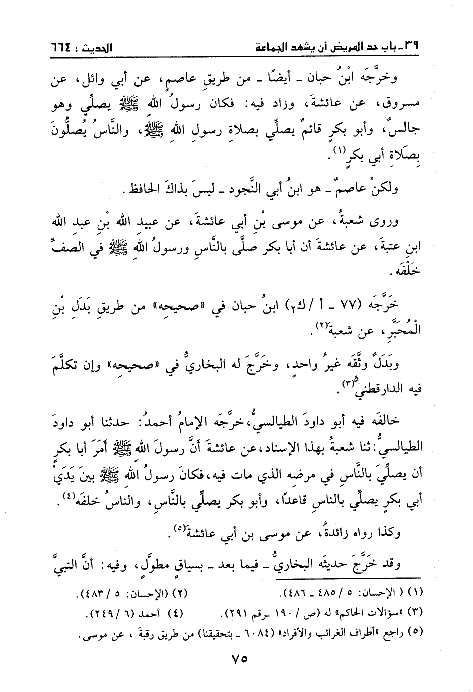 وخرجه ابن حبان – أَيْضاً – من طريق عاصم، عَن أَبِي وائل، عَن مسروق، عَن عَائِشَة، وزاد فِيهِ: فكان رَسُول الله - صَلَّى اللهُ عَلَيْهِ وَسَلَّمَ - يصلي وَهُوَ جالس، وأبو بَكْر قائم يصلي بصلاة رَسُول الله - صَلَّى اللهُ عَلَيْهِ وَسَلَّمَ -، والناس يصلون بصلاة أَبِي بَكْر.