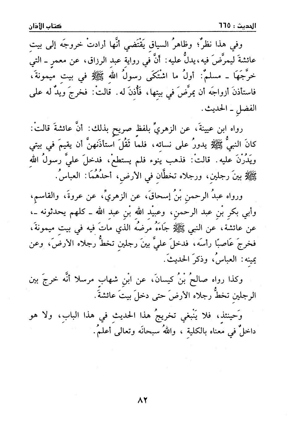 ورواه عَبْد الرحمان بْن إِسْحَاق، عَن الزُّهْرِيّ، عَن عُرْوَةَ والقاسم وأبي بَكْر ابن عَبْد الرحمان وعبيد الله بْن عَبْد االله، كلهم يحدثونه عَن عَائِشَة، عَن النَّبِيّ - صَلَّى اللهُ عَلَيْهِ وَسَلَّمَ -: جاءه مرضه الَّذِي مات فِيهِ في بيت ميمونة، فخرج عاصباً رأسه، فدخل عَلِيّ بَيْن رجلين، تخط رجلاه الأرض، وعن يمينه العباس - وذكر الحَدِيْث.