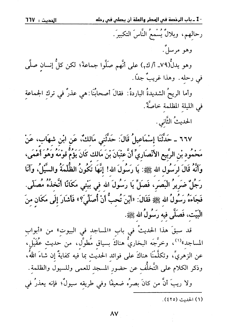 667 – حَدَّثَنَا إِسْمَاعِيل، قَالَ: حَدَّثَنِي مَالِك، عَن أَيْنَ شِهَاب، عَن محمود بْن الربيع الأنصاري، أن عتبان بْن مَالِك كَانَ يؤم قومه أعمى، وأنه قَالَ لرسول الله - صَلَّى اللهُ عَلَيْهِ وَسَلَّمَ -: يَا رَسُول الله، إنها تكون الظلمة السيل، وأنا رَجُل ضرير البصر، فصل يَا رَسُول الله فِي بيتي مكاناً أتخذه مصلى. فجاءه رَسُول الله - صَلَّى اللهُ عَلَيْهِ وَسَلَّمَ -، فَقَالَ: ((أين تحب أن أصلي؟)) فأشار إلى مكان من البيت، فصلى فِيهِ رَسُول الله - صَلَّى اللهُ عَلَيْهِ وَسَلَّمَ -.