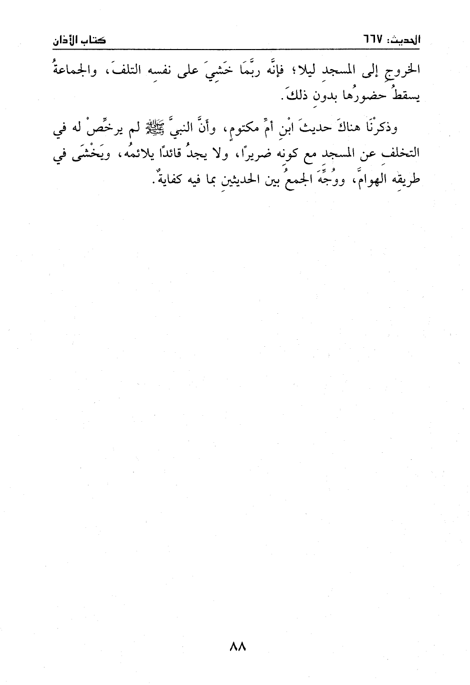 وذكرنا هناك حَدِيْث ابن أم مكتوم، وأن النَّبِيّ - صَلَّى اللهُ عَلَيْهِ وَسَلَّمَ - لَمْ يرخص لَهُ فِي التخلف عَن المسجد، مَعَ كونه ضريراً ولا يجد قائداً يلائمه، ويخشى فِي طريقه الهوام، ووجه الجمع بَيْن الحديثين بما فِيهِ كفاية.