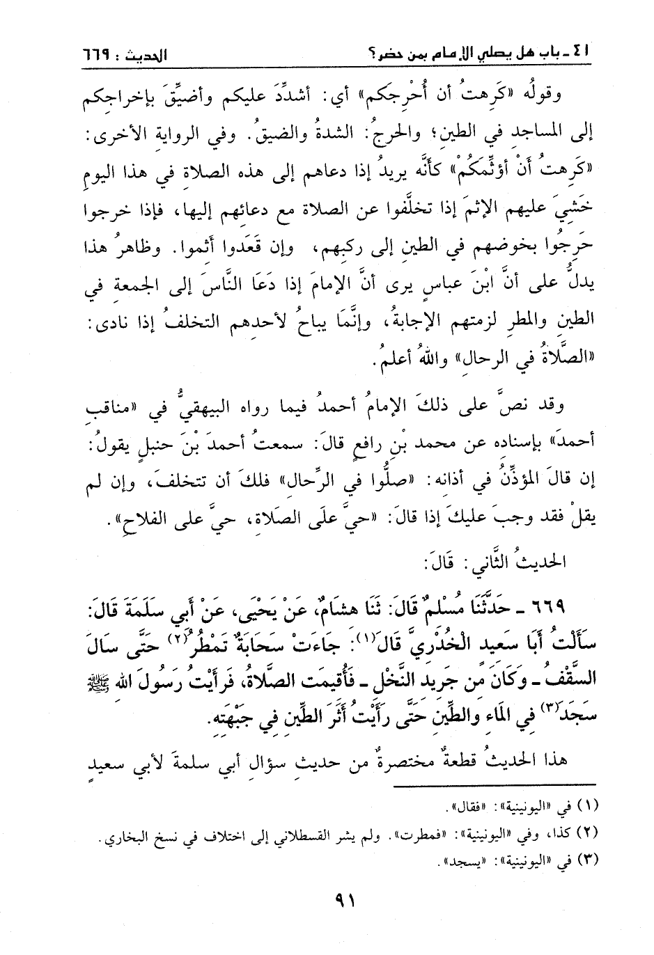 669 – حَدَّثَنَا مُسْلِم، قَالَ: ثنا هِشَام، عَن يَحْيَى، عَن أَبِي سَلَمَة، قَالَ: سألأت أَبَا سَعِيد الْخُدرِيَّ، قَالَ: جاءت سحابة بمطر حَتَّى سَأَلَ السقف، وكان من جريد النخل، فأقيمت الصلاة، فرأيت رَسُول الله - صَلَّى اللهُ عَلَيْهِ وَسَلَّمَ - سجد فِي الماء والطين، حَتَّى رأيت أثر الطين فِي جبهته.
