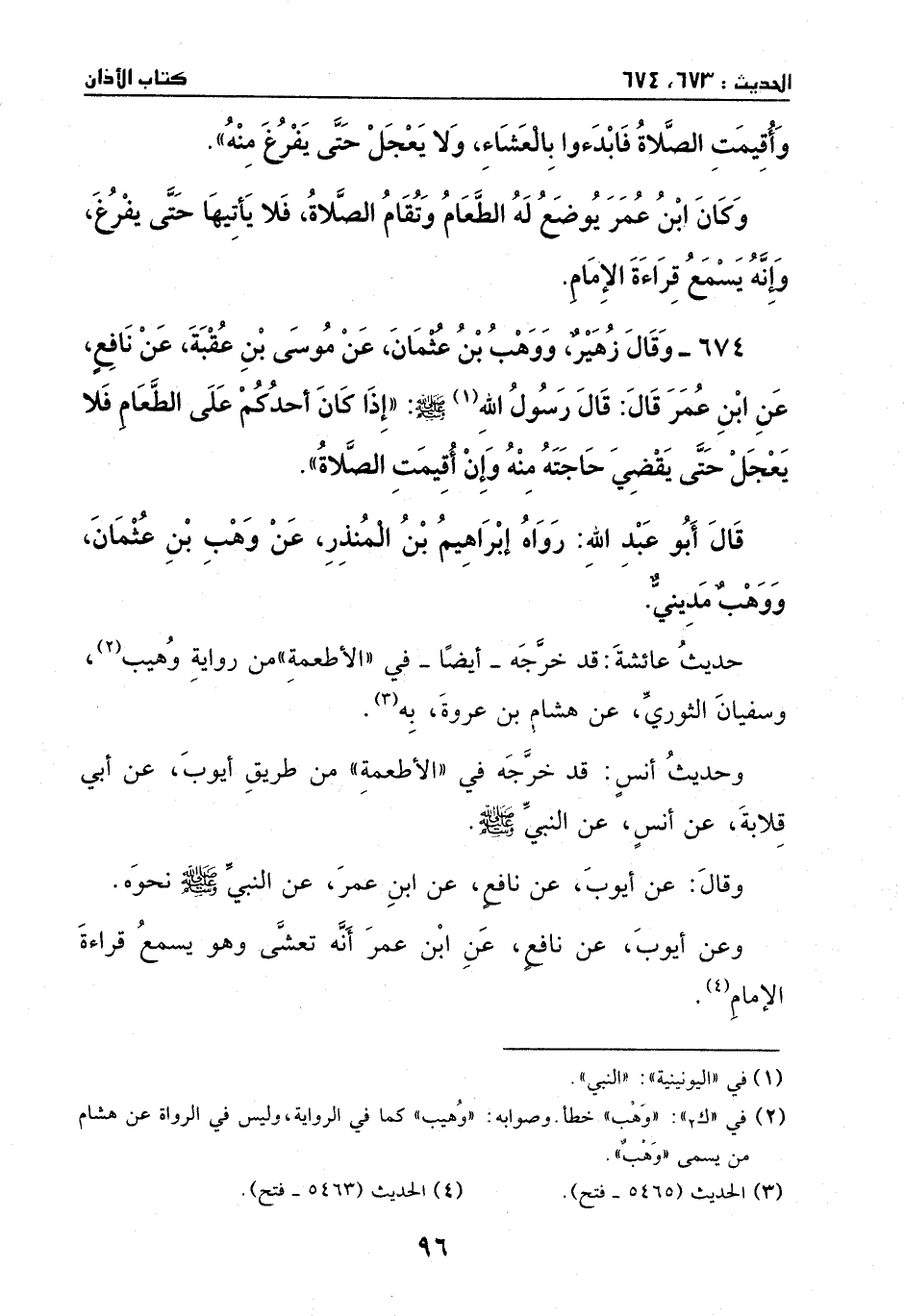 674 – وَقَالَ زهير ووهب بْن عُثْمَان، عَن موسى بْن عقبة، عَن نَافِع، عَن ابن عُمَر، قَالَ: قَالَ رَسُول الله - صَلَّى اللهُ عَلَيْهِ وَسَلَّمَ -: ((إذا كَانَ أحدكم عَلَى الطعام فلا يعجل حَتَّى يقضي حاجته مِنْهُ، وإن أقيمت الصلاة)) .