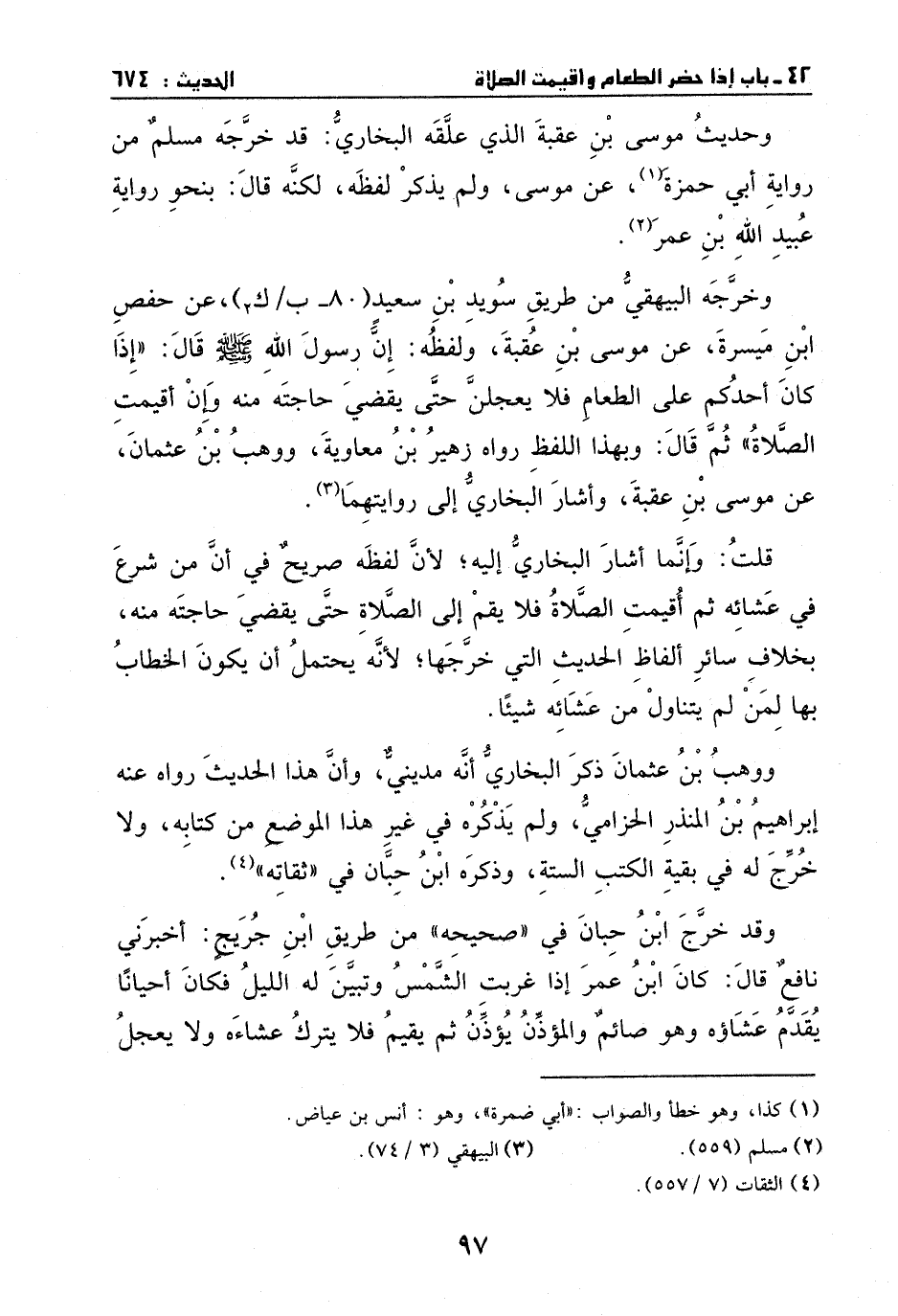 وخرجه البيهقي من طريق سويد بْن سَعِيد، عَن حفص بْن ميسرة، عَن موسى بْن عقبة، ولفظه: إن رَسُول الله - صَلَّى اللهُ عَلَيْهِ وَسَلَّمَ - قَالَ: ((إذا كَانَ أحدكم عَلَى الطعام فلا يعجلن حَتَّى يقضي حاجته مِنْهُ، وإن أقيمت الصلاة)) .