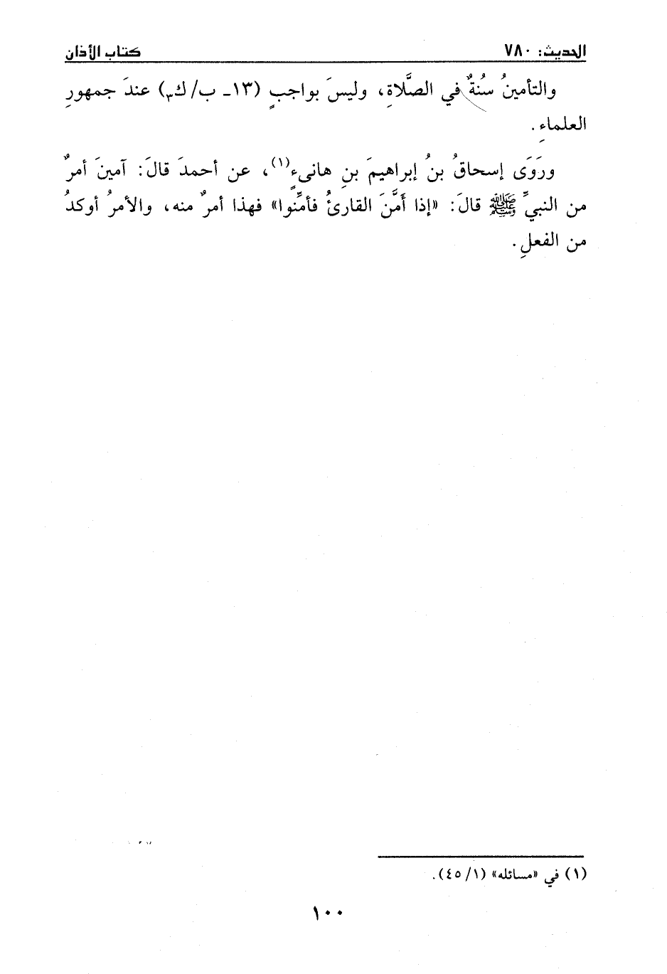 وروى إسحاق بن إبراهيم بن هانئ، عن أحمد، قال: آمين أمر من النبي - صَلَّى اللهُ عَلَيْهِ وَسَلَّمَ - قال: ((إذا أمن القارئ فأمنوا)) فهذا أمر منه، والأمر أوكد من الفعل.
