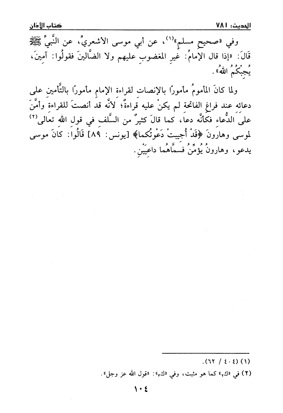 وفي ((صحيح مسلم)) عن أبي موسى الأشعري، عن النبي - صَلَّى اللهُ عَلَيْهِ وَسَلَّمَ -، قال: ((إذا قال الإمام: {غَيْرِ الْمَغْضُوبِ عَلَيْهِمْ وَلا الضَّالِّينَ} فقولوا: آمين، يجبكم الله)) .