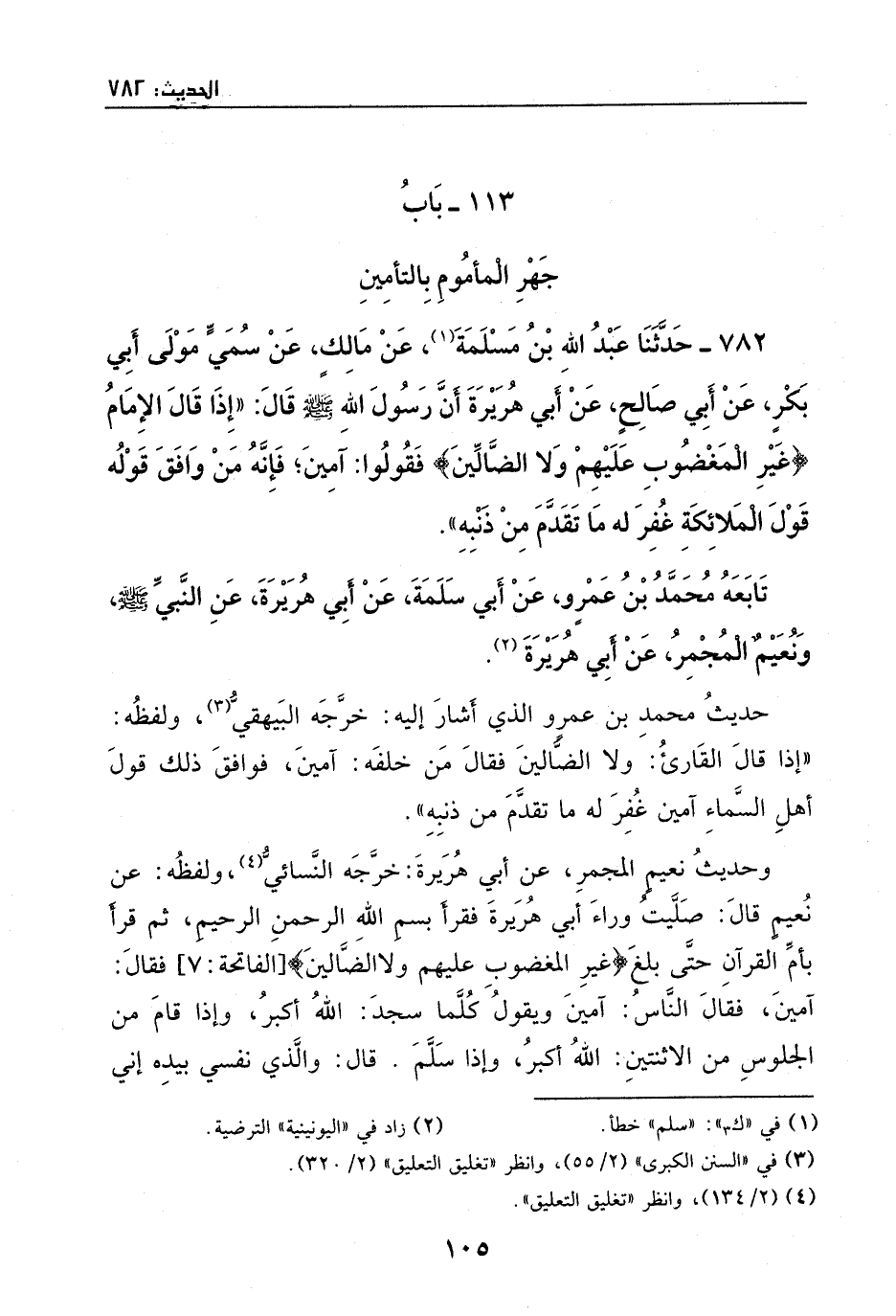 782 - حدثنا عبد الله بن مسلمة، عن مالك، عن سمي مولى أبي بكر، عن أبي صالح، عن أبي هريرة، أن رسول الله - صَلَّى اللهُ عَلَيْهِ وَسَلَّمَ - قال: ((إذا قال الإمام: {غَيْرِ الْمَغْضُوبِ عَلَيْهِمْ وَلا الضَّالِّينَ} فقولوا آمين؛ فإنه من وافق قوله قول الملائكة غفر له ما تقدم من ذنبه)) .