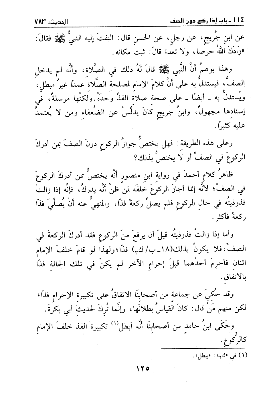 وهذا يوهم أن النبي - صَلَّى اللهُ عَلَيْهِ وَسَلَّمَ - قال له ذلك في الصلاة، وأنه لم يدخل الصف، فيستدل به على أن كلام الإمام لمصلحة الصلاة عمداً غير مبطل، ويستدل به –أيضاً - على صحة صلاة الفذ وحده، ولكنها مرسلة، في إسنادها مجهول، وابن جريج كان يدلس عن الضعفاء ومن لا يعتمد عليه كثيراً.