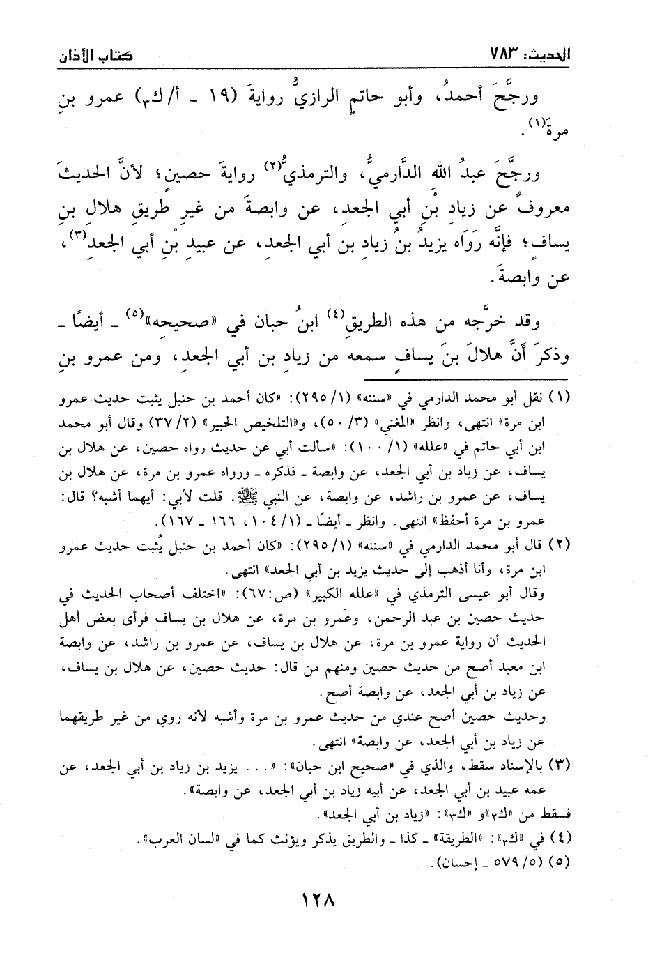 ورجح عبد الله الدارمي والترمذي رواية حصين؛ لأن الحديث معروف عن