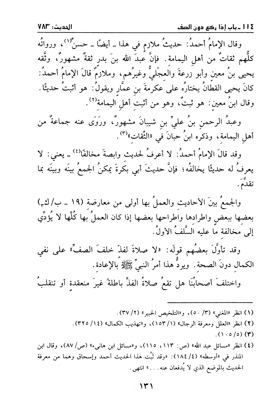وقد تأول بعضهم قوله: ((لا صلاة لفذ خلف الصف)) على نفي الكمال دون الصحة: ويرد هذا أمر النبي - صَلَّى اللهُ عَلَيْهِ وَسَلَّمَ - له بالإعادة.