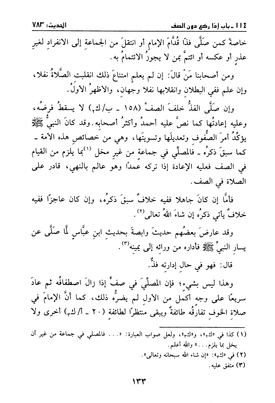 وقد كان النبي - صَلَّى اللهُ عَلَيْهِ وَسَلَّمَ - يؤكد أمر الصفوف وتعديلها وتسويتها، وهي من خصائص هذه الأمة كما سبق ذكره، فالمصلي في جماعة من غير مخل بما يلزم من القيام في الصف، فعليه الإعادة إذا تركه عمداً، وهو عالم بالنهي، قادر على الصلاة في الصف. فأما إن كان جاهلاً ففيه خلاف سبق ذكره. وإن كان عاجزاً ففيه خلاف يأتي ذكره – إن شاء الله تعإلى.