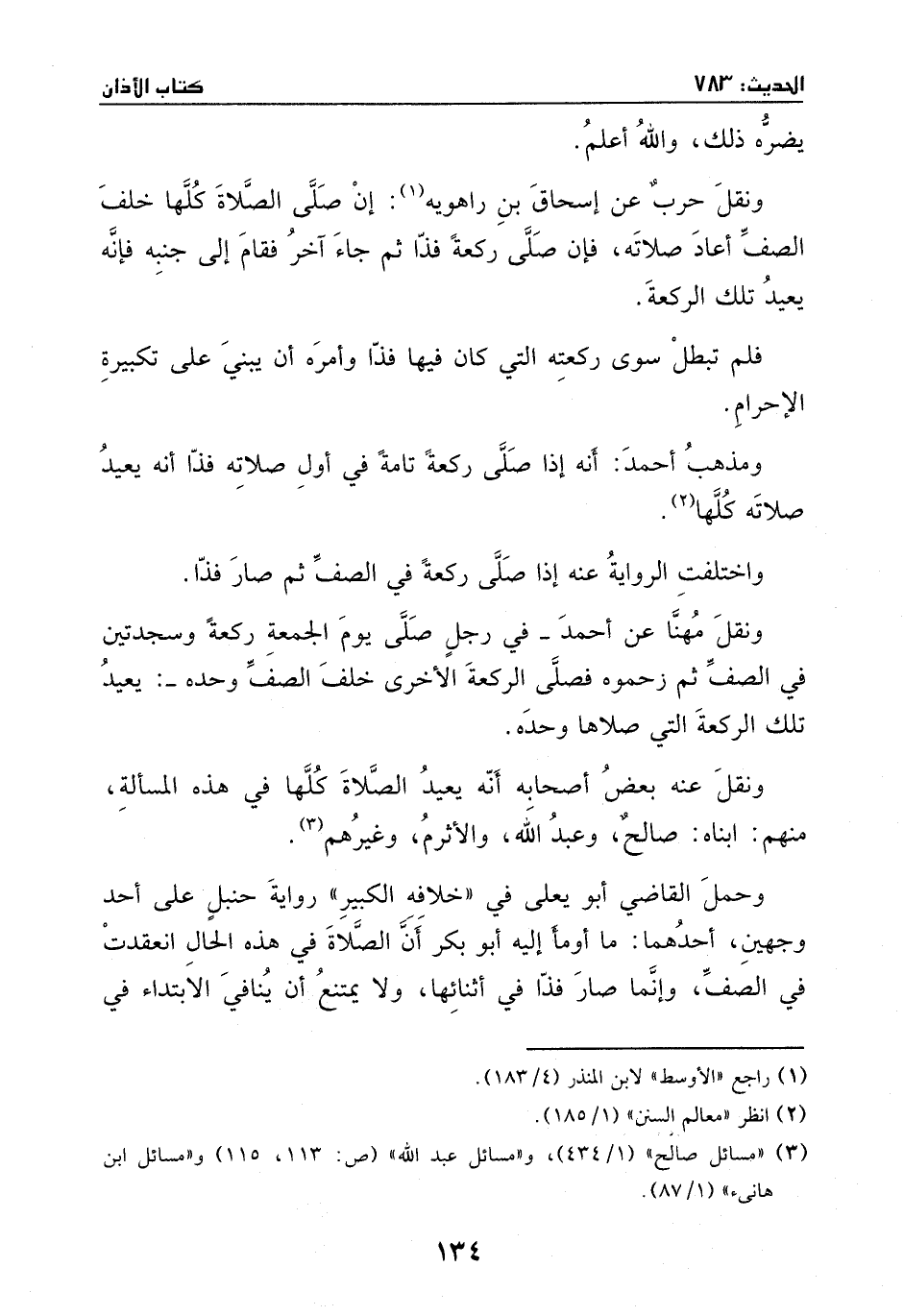 ونقل حرب، عن إسحاق بن راهويه: أن صلى الصلاة كلها خلف الصف أعاد صلاته، فأن صلى ركعة فذاً، ثم جاء أخر فقام إلى جنبه، فإنه يعيد تلك الركعة، فلم تبطل سوى ركعته التي كان فيها فذاً، وأمره أن يبني على تكبيرة الإحرام ومذهب أحمد: أنه إذا صلى ركعةً تامةً في أول صلاته فذاً أنه يعيد صلاته كلها واختلفت الرواية عنه: إذا صلى ركعة في الصف ثم صار فذاً.