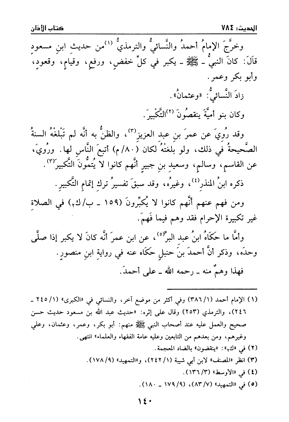 وخرَّج الإمام أحمد والنسائي والترمذي من حديث ابن مسعود، قال: كان النبي - صَلَّى اللهُ عَلَيْهِ وَسَلَّمَ - يكَّبر في كل خفض ورفع وقيام وقعود، وأبو بكر وعمر.