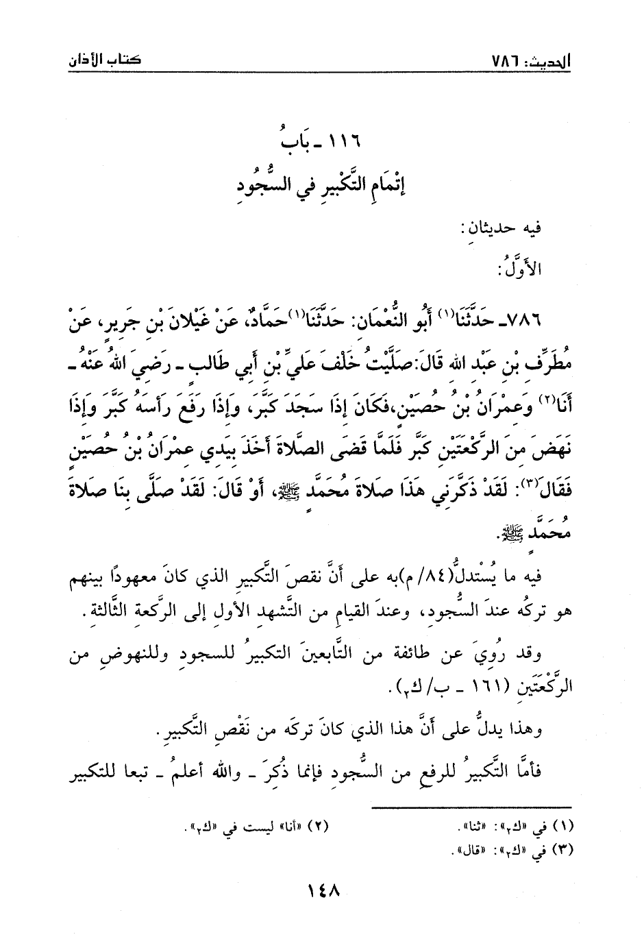 حدثنا أبو النعمان: حدثنا حماد، عن غيلان بن جرير، عن مطرف بن عبد الله، قال: صليت خلف علي ابن أبي طالب – رضي الله عنه – أنا وعمران بن حصين، فكان إذا سجد كبر، وإذا رفع رأسه كبر، وإذا نهض من الركعتين كَّبر، فلما قضى الصلاة أخذ بيدي عمران بن حصين، فقال: لقد ذكرني هذا صلاة محمد - صَلَّى اللهُ عَلَيْهِ وَسَلَّمَ - أو قال: لقد صلى بنا صلاةَ محمدَ - صَلَّى اللهُ عَلَيْهِ وَسَلَّمَ -.