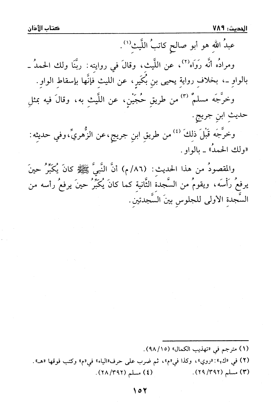 عبد الله، هو: أبو صالح كاتب الليث. ومراده: أنه رواه عن الليث. وقال في روايته ((ربنا ولك الحمد)) بالواو، بخلاف رواية يحيى بن بكير عن الليث، فإنها بإسقاط الواو. وخَّرجه مسلم من طريق حجين، عن الليث به، وقال فيه: بمثل حديث ابن جريح. وخَّرجه قبل ذلك من طريق ابن جريح، عن الزهري، وفي حديثه ((ولك الحمد)) بالواو. والمقصود من هذا الحديث: أن النبي - صَلَّى اللهُ عَلَيْهِ وَسَلَّمَ - كان يكَّبر حين يرفع رأسه ويقوم من السجدة الثانية، كما كان يكبر حين يرفع رأسه من السجدة الأولى للجلوس بين السجدتين.