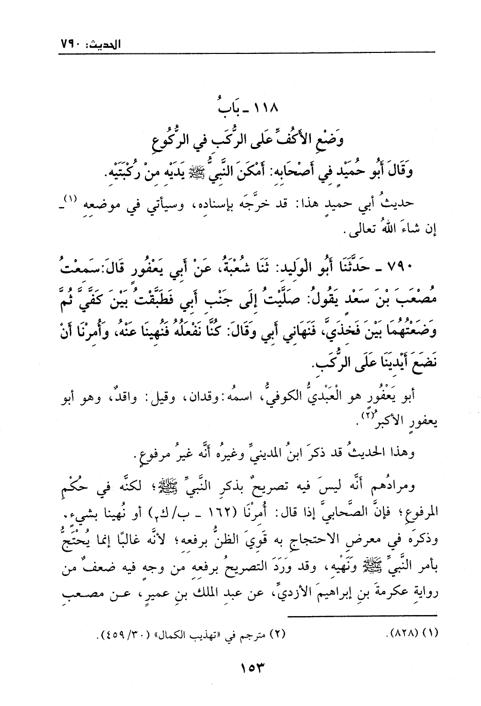 790 - حدثنا أبو الوليد: نا شعبة، عن أبي يعفور، قال: سمعت مصعب بن سعد يقول: صليت إلى جنب أبي، فطبقت بين كفي، ثم وضعتهما بين فخذي، فنهاني أبي، وقال: كنا نفعله فنهينا عنه، وامرنا أن نضع أيدينا على الركب.