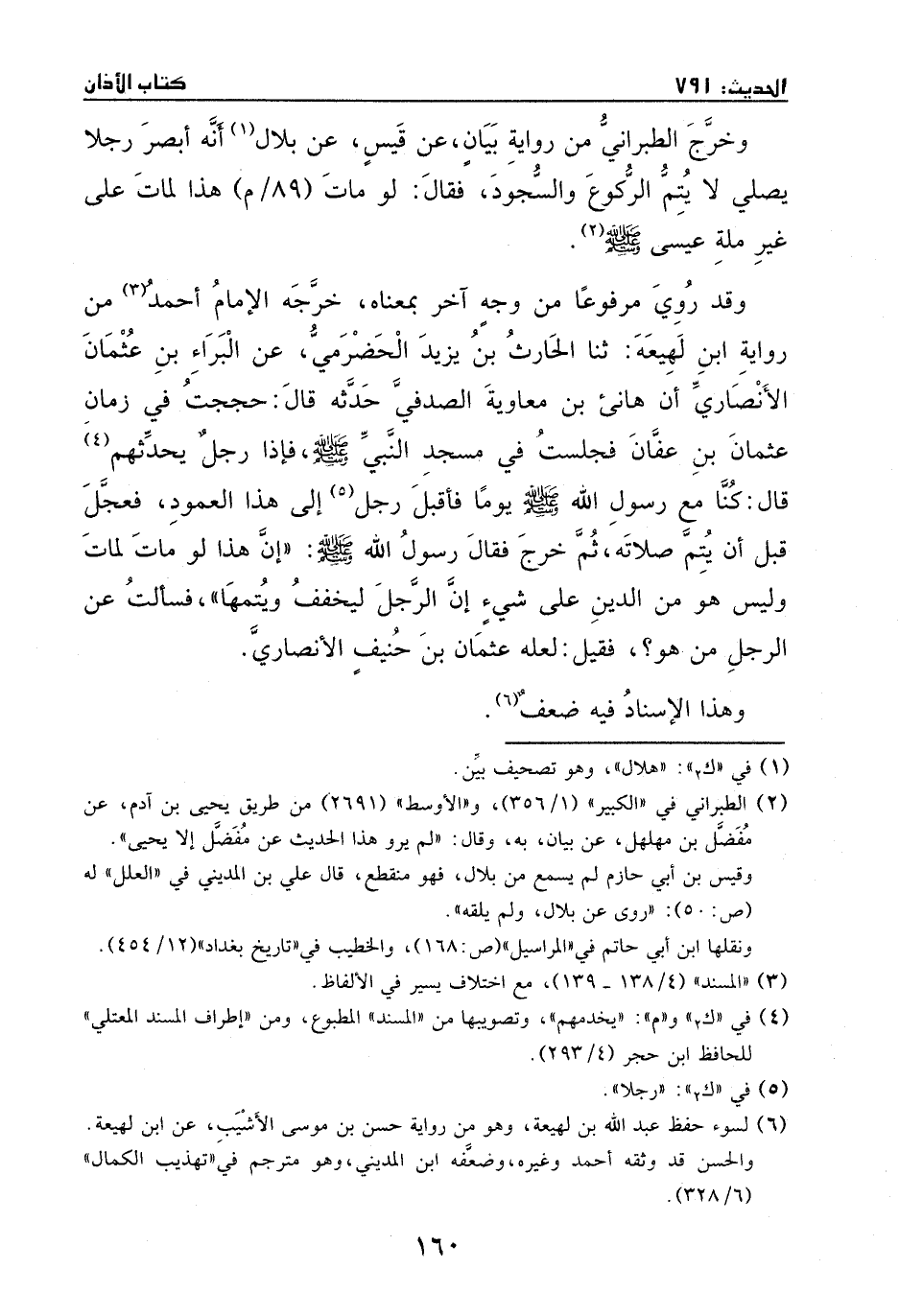وخرَّج الطبراني من روايه بيأن، عن قيس، عن بلال، أنه ابصر رجلاً يصلي لا يتم الركوع والسجود، فقال: لو مات هذا لمات على غير ملة عيسى - صَلَّى اللهُ عَلَيْهِ وَسَلَّمَ -.