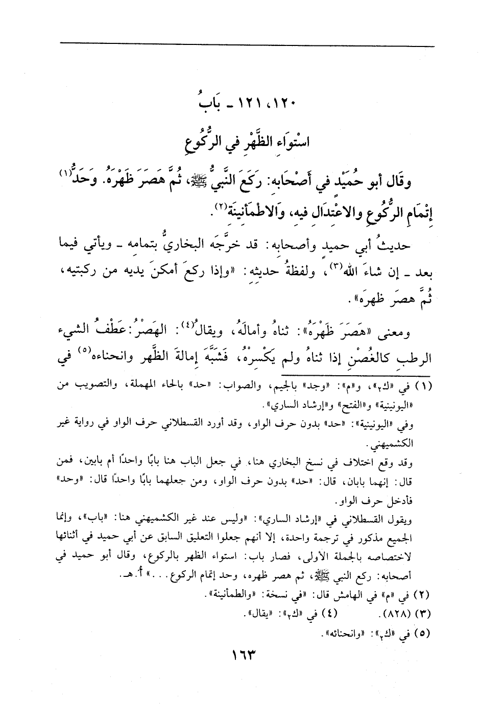 وقال أبو حميد – في أصحابه – ركع النبي - صَلَّى اللهُ عَلَيْهِ وَسَلَّمَ - ثم هصر ظهره. وحد إتمام الركوع والاعتدال فيه، والاطمأنينة. حديث أبي حميد واصحابه قد خرجه. البخاري بتمامه، ويأتي فيما بعد –إن شاء الله – ولفظ حديثه: ((وإذا ركع أمكن يديه من ركبتيه، ثم هصر ظهره)) .