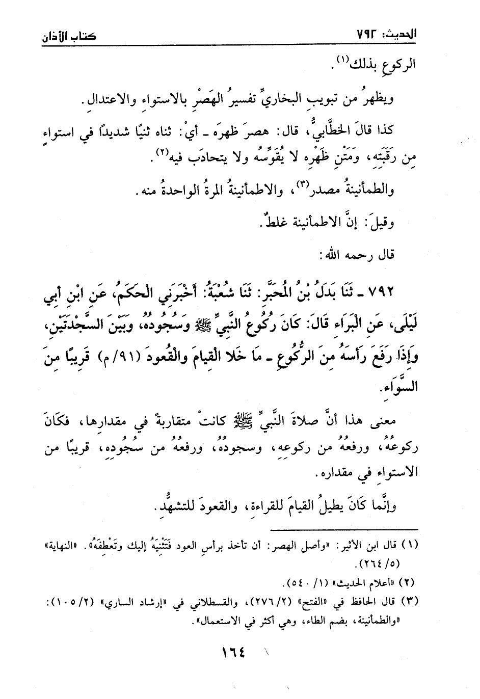 الركوع بذلك ويظهر من تبويب البخاري تفسير الهصر بالاستواء والاعتدال، وكذا قال الخطابي قال: هصر ظهره: أي ثناه ثنياً شديداً في استواءٍ من رقبته ومتن ظهره لايقوسه، ولا يتحادب فيه والطمأنينة: مصدر. والاطمأنينة: المرة الواحدة منه.