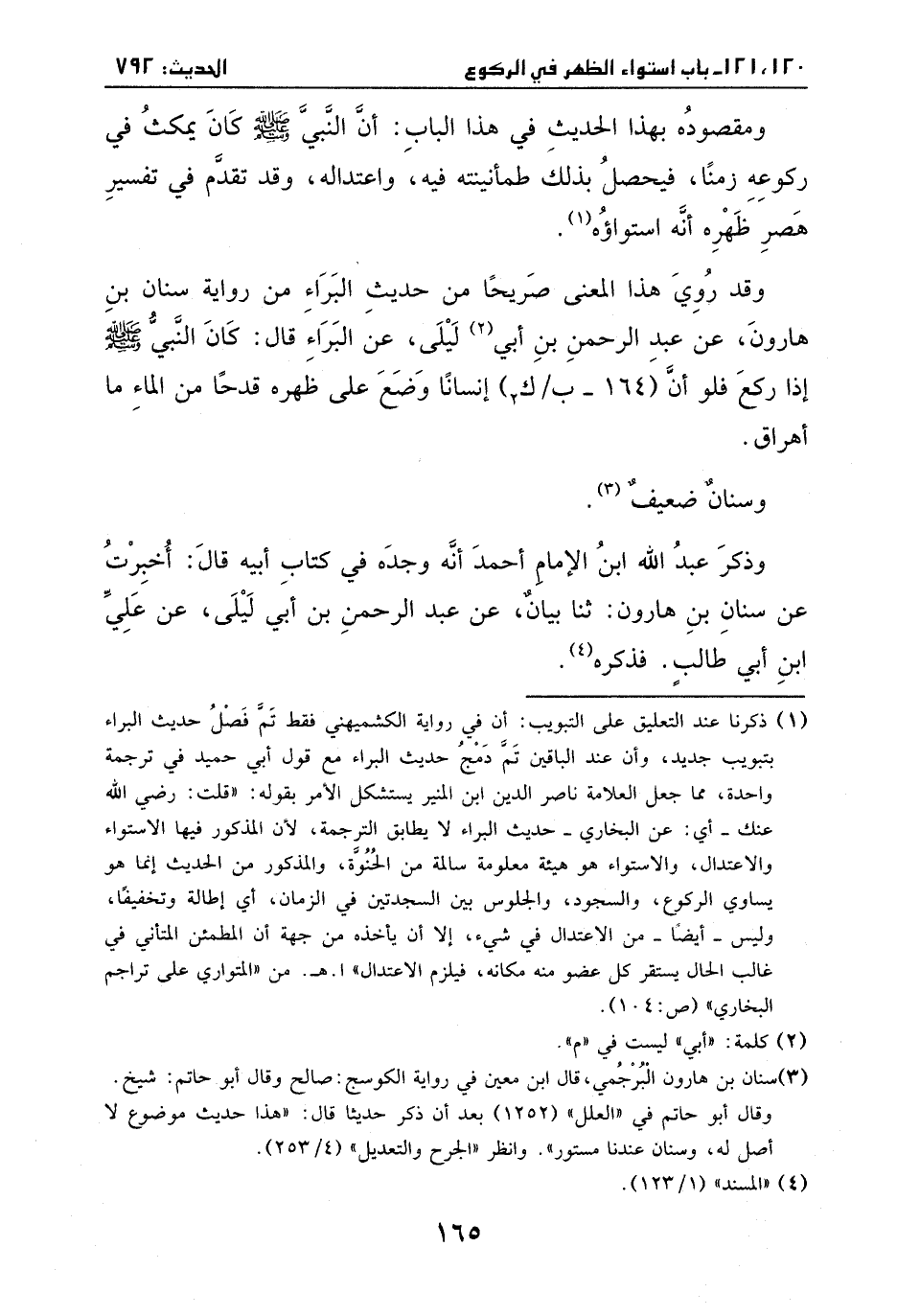 وقد روي هذا المعنى صريحاً من حديث البراء، من رواية سنان بن هارون، عن عبد الرحمن بن أبي ليلى، عن البراء، قال: كان النبي - صَلَّى اللهُ عَلَيْهِ وَسَلَّمَ - إذا ركع فلو أن إنسانا وضع على ظهره قدحا من الماء ما اهراق.