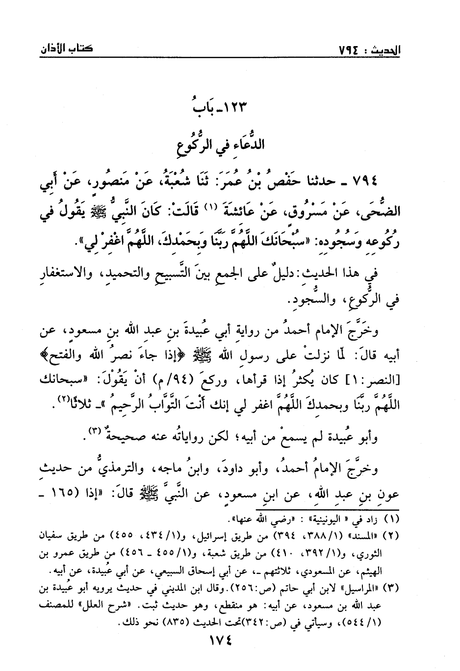 وخرَّج الإمام أحمد من رواية أبي عبيدة بن عبد الله بن مسعود، عن أبيه، قال: لمَّا نزلت على رسول الله - صَلَّى اللهُ عَلَيْهِ وَسَلَّمَ - {إِذَا جَاءَ نَصْرُ اللَّهِ وَالْفَتْحُ} [النصر:1] كان يكثر إذا قرأها وركع أن يقول: ((سبحانك اللهم ربنا وبحمدك، اللهم أغفر لي، إنك أنت التواب الرحيم)) –ثلاثا -.