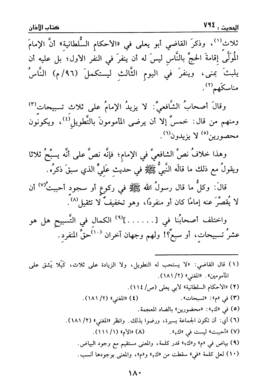 وهذا خلاف نص الشافعي في الإمام، فإنه نص على أنه يسبح ثلاثاً، ويقول مع ذلك ما قاله النبي - صَلَّى اللهُ عَلَيْهِ وَسَلَّمَ - في حديث علي الذي سبق ذكره. قال: وكل ما قال رسول الله - صَلَّى اللهُ عَلَيْهِ وَسَلَّمَ - في ركوعٍ أو سجودٍ أحببت أن لا يقصر عنه، إماماً كان أو منفرداً، وهو تخفيف لا تثقيل.