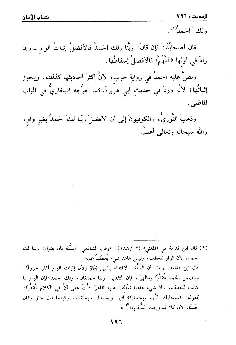 قال أصحابنا: فإن قال: ((ربنا ولك الحمد)) فالأفضل أثبات الواو، وإن زاد في أولها: ((اللهم)) فالأفضل إسقاطها، ونص عليه أحمد في رواية حرب؛ لأن أكثر أحاديثها كذلك، ويجوز إثباتها، لأنه ورد في حديث أبي هريرة، كما خرَّجه البخاري في الباب الماضي.