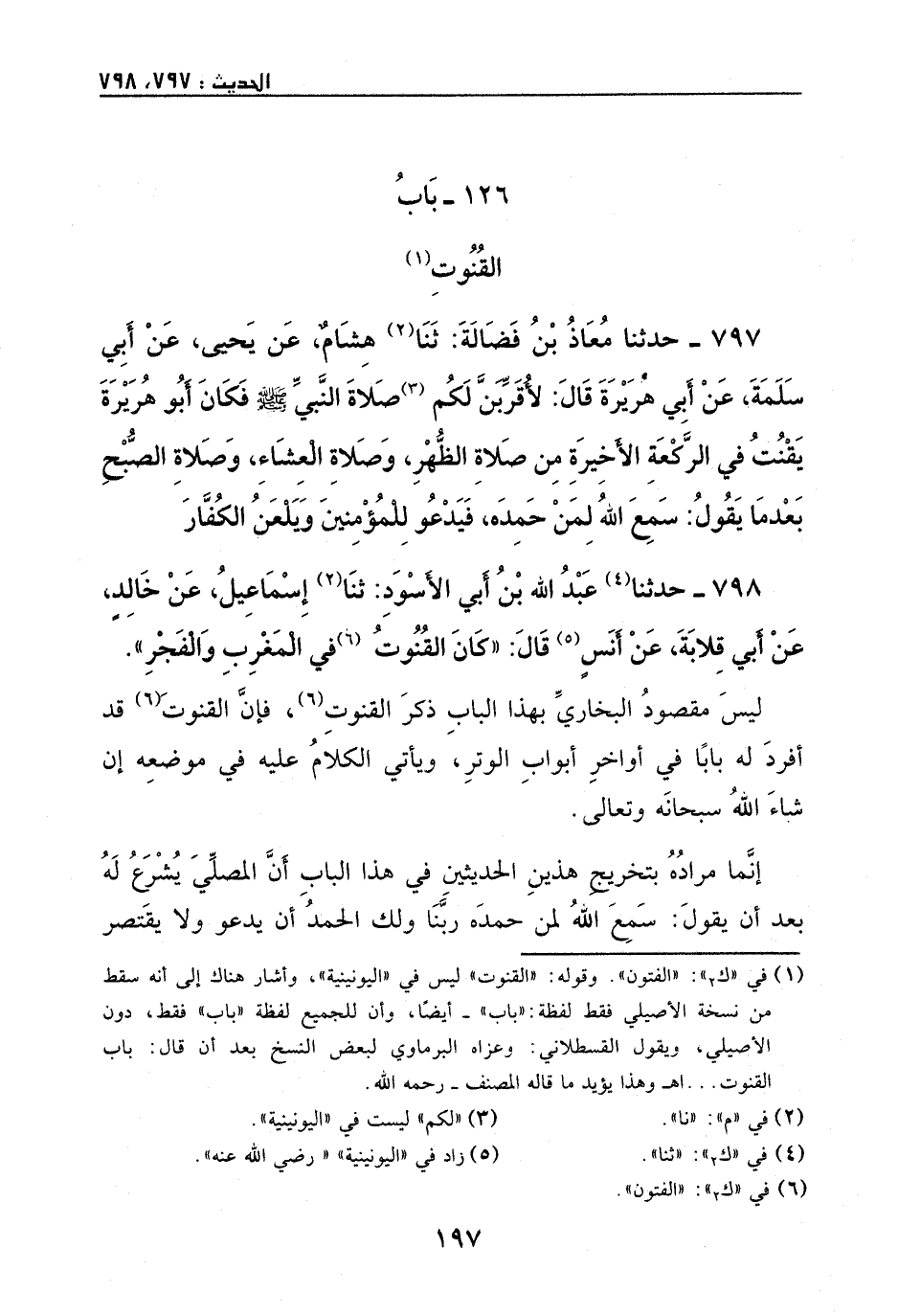 797 - حدثنا معاذ بن فضالة: نا هشام، عن يحيى، عن أبي سلمة، عن أبي هريرة، قال: لأقربن لكم صلاة النبي - صَلَّى اللهُ عَلَيْهِ وَسَلَّمَ -. فكان أبو هريرة يقنت في الركعة الأخيرة من صلاة الظهر وصلاة العشاء، وصلاة الصبح، بعدما يقول: ((سمع الله لمن حمده)) فيدعو للمؤمنين، ويلعن الكفار.