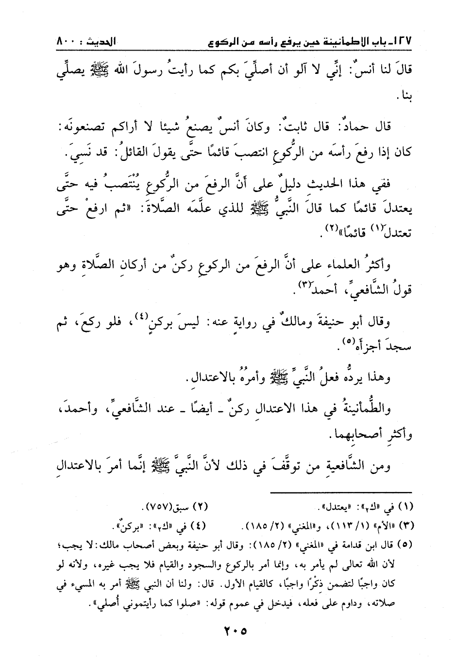 قال لنا أنس: أني لا ألو أن اصلي بكم كما رأيت رسول الله - صَلَّى اللهُ عَلَيْهِ وَسَلَّمَ - يصلي بنا. قال حماد: قال ثابت: وكان أنس يصنع شيئاً لا أراكم تصنعونه، كان إذا رفع رأسه من الركوع أنتصب قائماً، حتى يقول القائل: قد نسي.